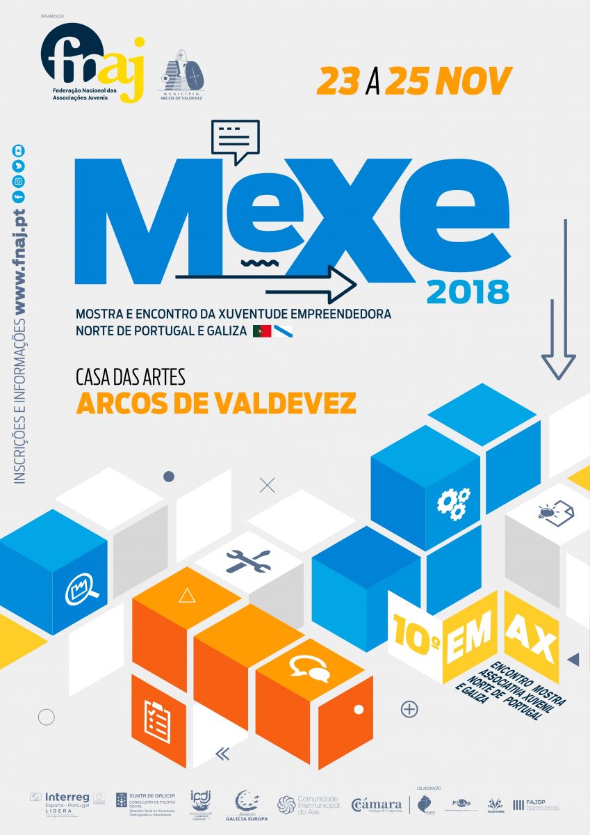 A FNAJ – Federação Nacional das Associações Juvenis vai organizar o MEXE - MOSTRA E ENCONTRO DA XUVENTUDE EMPREENDEDORA, do Norte de Portugal e da Galiza (10ºEMAX), a ter lugar entre 23 e 25 de Novembro de 2018, na Casa das Artes de ARCOS DE VALDEVEZ.